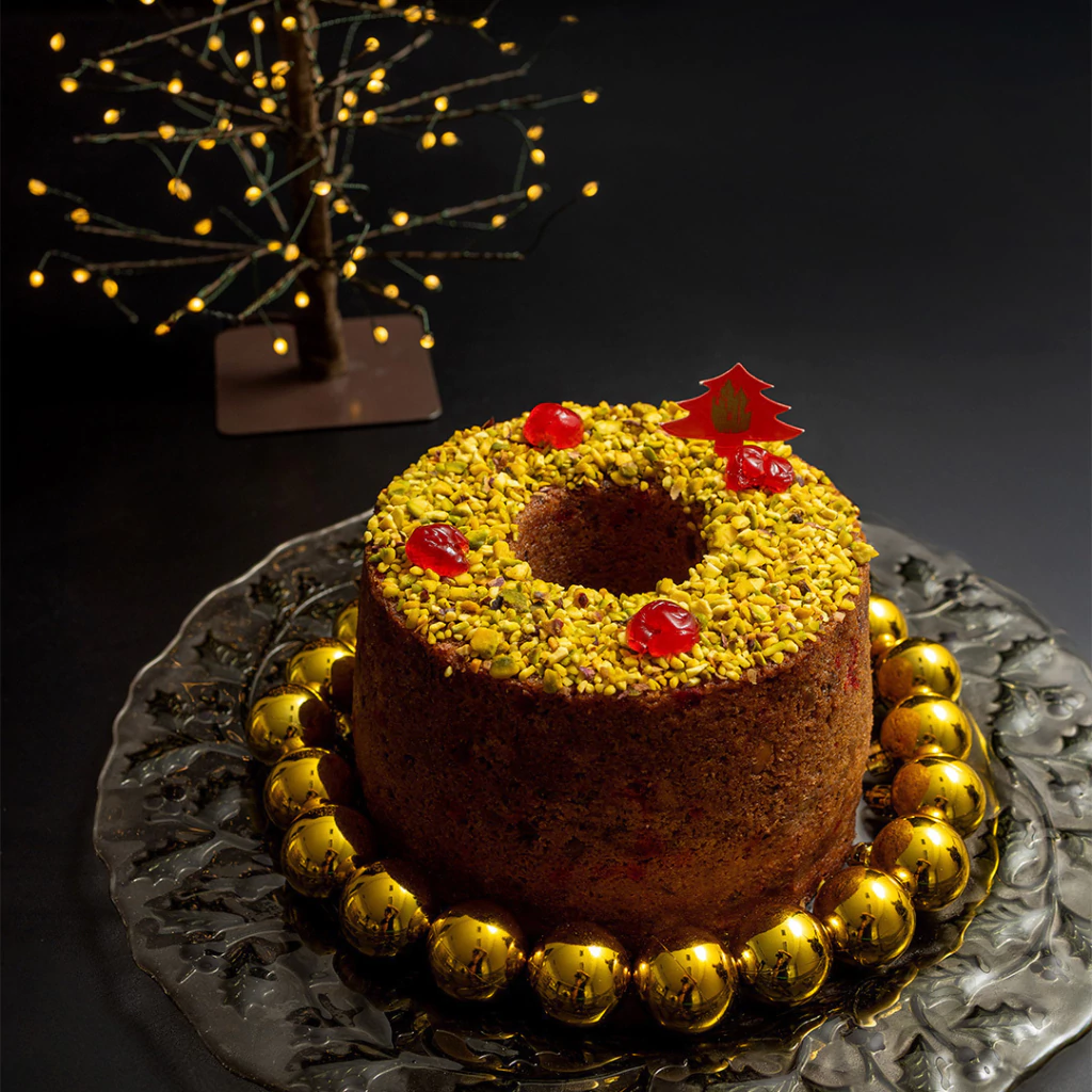 Chocolate, pistache, cereja, conhaque, tâmaras e geleia de damasco. 1,300kg